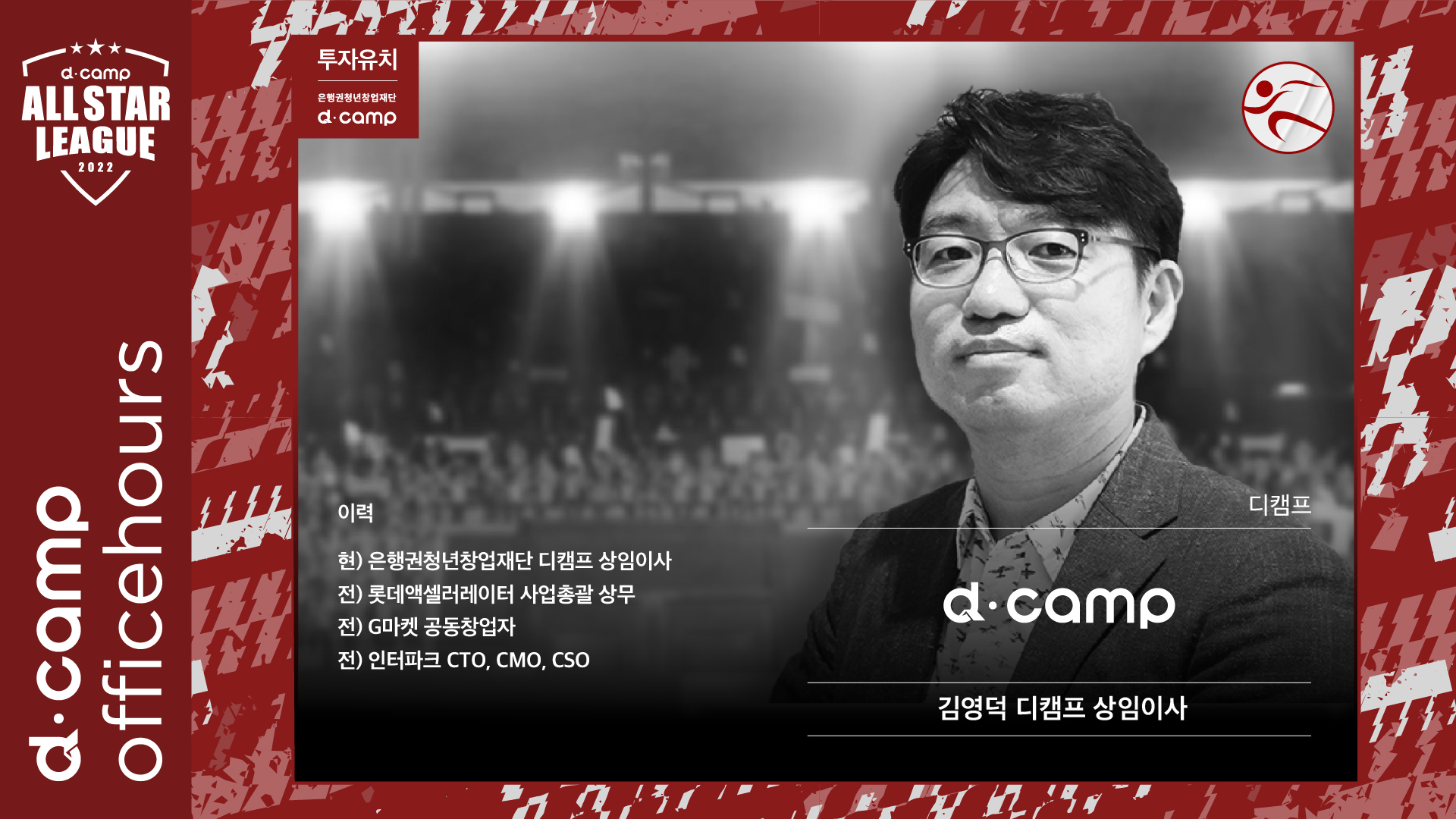 2021년 2월부터 국내 최대 규모의 창업기관인 디캠프의 수장으로 취임하여 스타트업 투자와 육성을 통한 국내 창업 생태계 활성화에 기여하고 있습니다.