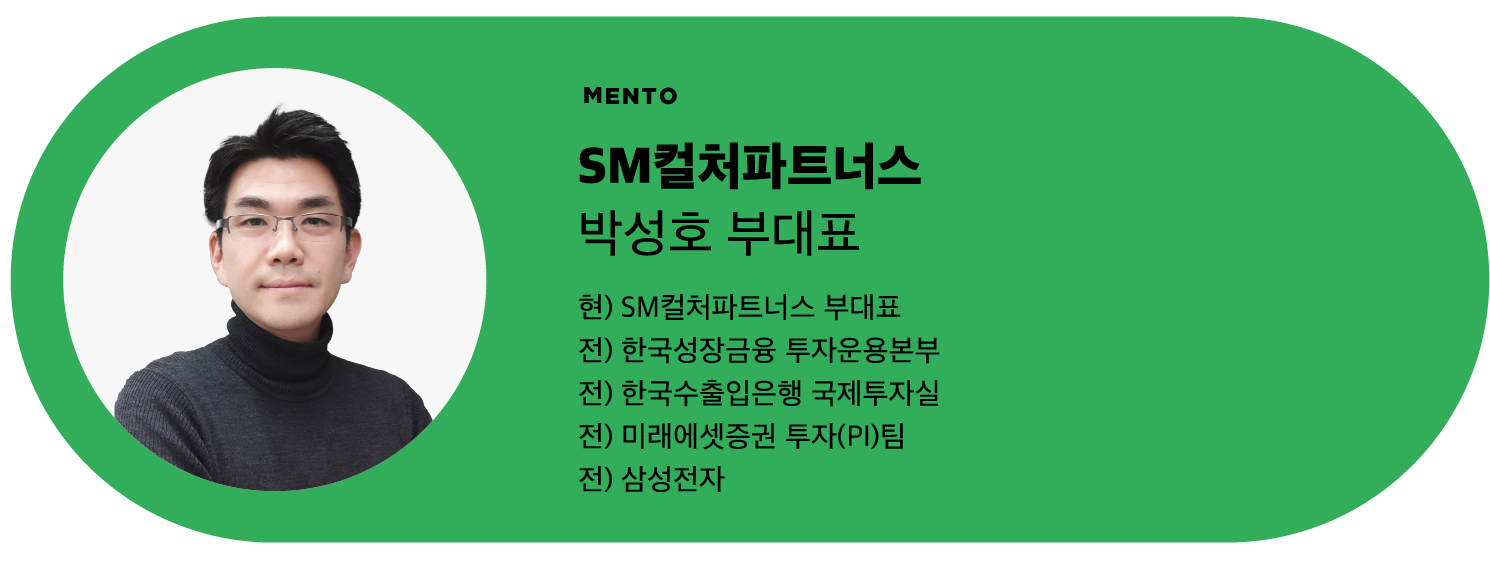 SM컬처파트너스는 2022년 새로이 설립된 SM엔터테인먼트그룹의 벤처투자전문 계열회사입니다. SM그룹이 보유한 최고의 K-POP IP 창출 역량과 함께 같이 성장할 유망한 창업기업을 찾고 있습니다. 창의적인 아이디어와 우수한 기술을 보유한 창업자 및 스타트업을 언제나 환영합니다.
