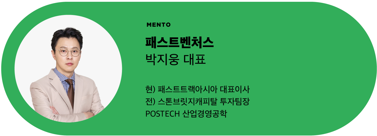 박지웅 대표는 벤처캐피탈 회사에서 투자심사역으로 4년간 경험을 쌓고, 배달의 민족, 크래프톤, 티몬 등의 유니콘 기업들에 대한 Series A/B 투자를 담당했습니다. 이후 패스트트랙아시아 및 패스트벤처스 대표가 되어, 헬로네이처 (SK플래닛에 M&A), 푸드플라이 (요기요에 M&A), 패스트파이브, 데이원컴퍼니 (전 패스트캠퍼스) 등의 다양한 분야의 성공적인 스타트업을 직접 만들고 성장시켰습니다.
