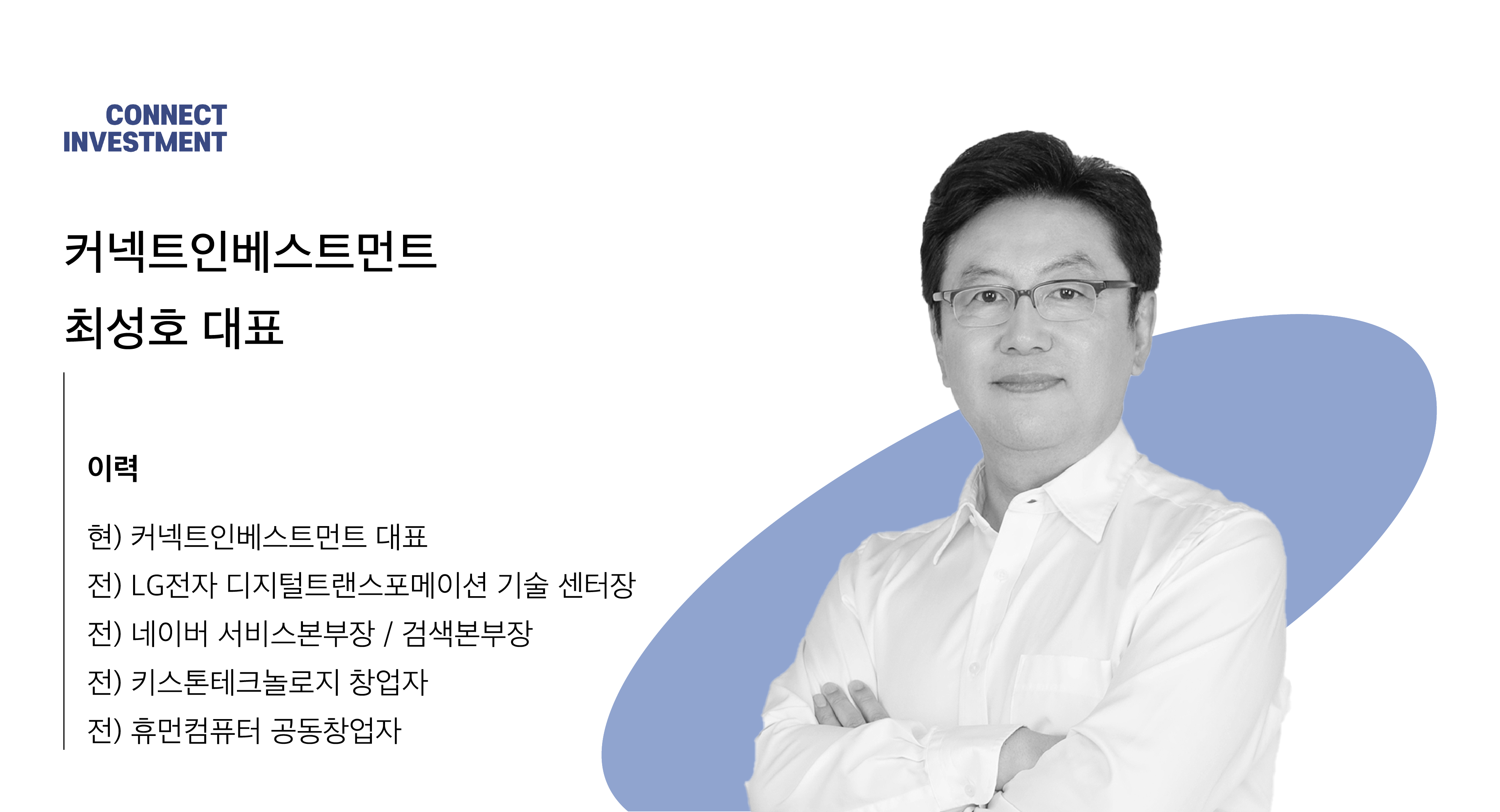 최성호 멘토님은 네이버에서 검색 · 서비스 본부장(옛 NHN 부사장)을 역임하시어 음악, 부동산, 금융, 쇼핑 등 인터넷 서비스 전반에 정통하십니다. 이후 LG전자에서 제조공정, Customer Service, Supply Chain Management 등 오퍼레이션 전 분야의 디지털 트랜스포메이션을 총괄하였고, 현재는 신생 VC인 커넥트인베스트먼트의 대표로서 디지털 혁신 스타트업을 발굴하여 투자를 이어가고 있습니다.