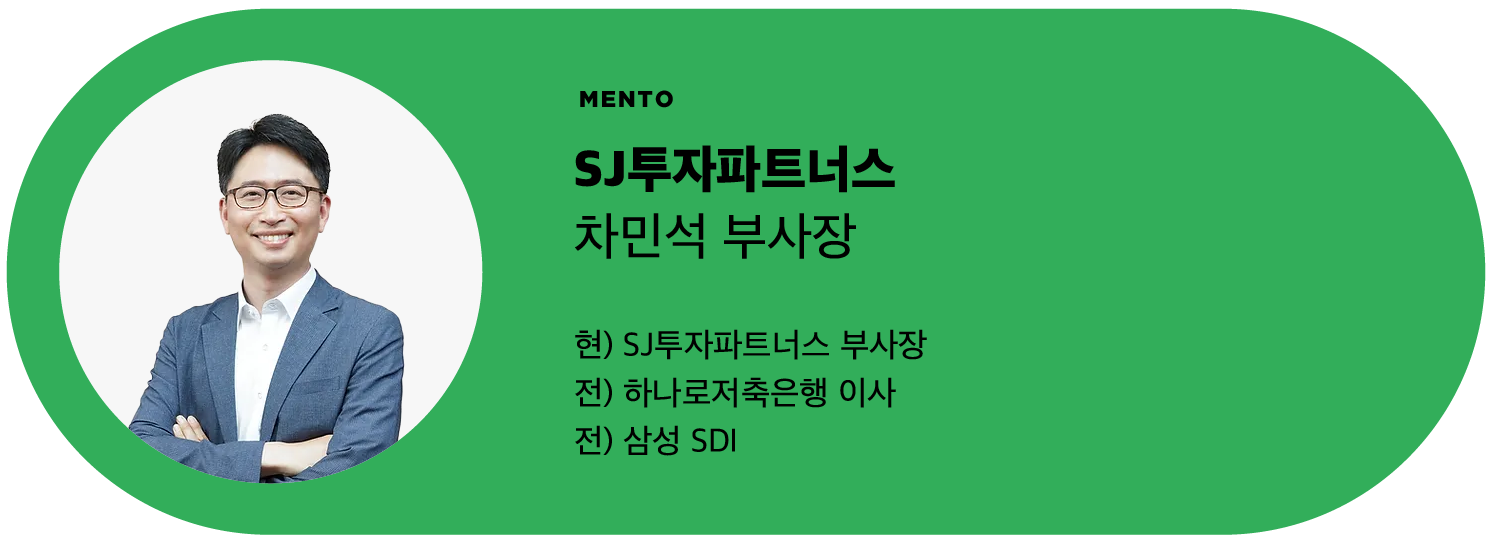 차민석 멘토는 삼성SDI에서 커리어를 시작, 이후 은행과 건설 관련회사의 경영진으로 일하며 사업 경험을 쌓았습니다. 창업부터 파산, 청산의 경험을 갖고있는 차민석 멘토는 단순 투자자가 아닌 창업자의 편에서 마음을 이해하려고 노력하고 있습니다.