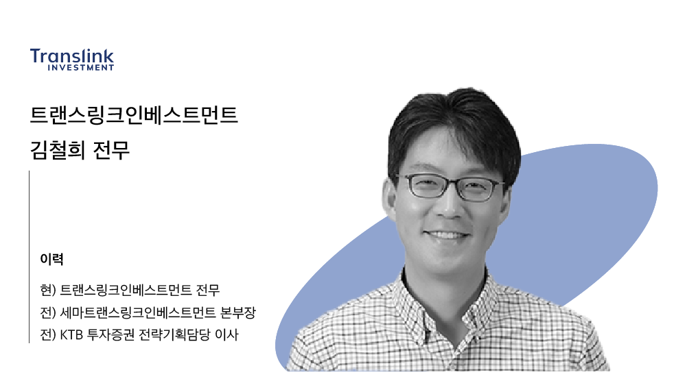 김철희 전무님이 몸담고 계신 Translink Investment는 국내 스타트업 생태계의 활성화와 국내외 스타트업의 성공적인 글로벌 진출을 목표로하는 창업투자회사(Venture Capital)입니다. 미국과 아시아를 아우르는 탄탄한 파트너 네트워크와 풍부한 글로벌 비즈니스 경험, 안정된 자산 운용을 바탕으로 세계를 향해 비상하고자 하는 국내 스타트업의 든든한 동반자가 되겠습니다.
